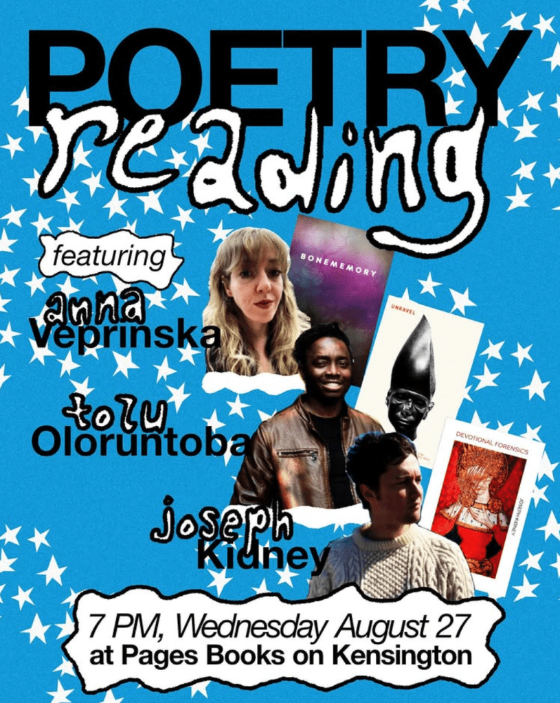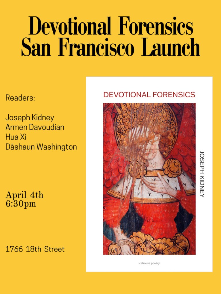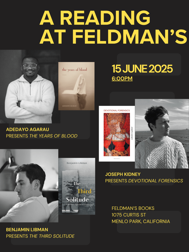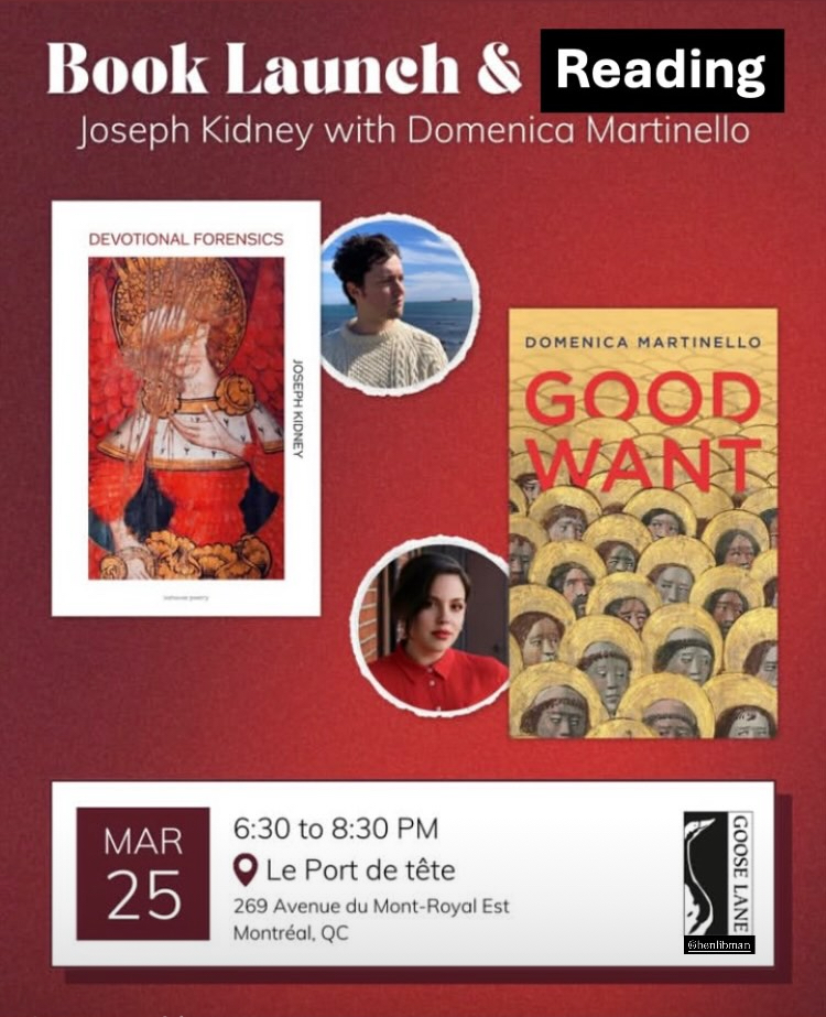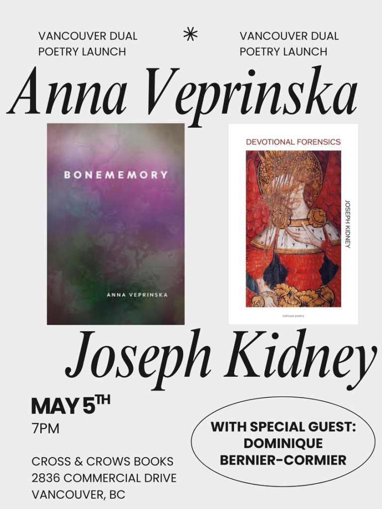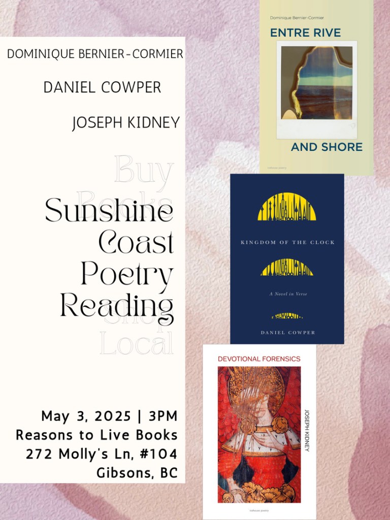 October 17th: San Francisco, CA (Litquake: Poets at the Bar, Make-Out Room, with July Westhale, Antony Fangary, Hieu Minh Nguyen, and Jessie Kie McCallum)October 3rd: Fredericton, NB (Poetry Weekend Event, with Qurat Dar, Shane Neilson, Jessica Hiemstra, and Sue Sinclair)September 20th: Vancouver, BC (Word Vancouver Festival, UBC Robson Square, with Calvin Wharton, Junie Désil, Natalie Lim, Lauren Peat, Renée Harper, Jen Currin, and Susan Alexander)August 27th: Calgary, AB (Pages Books on Kensington, with Anna Veprinska and Tolu Oloruntoba)August 3rd: Montréal, QC (Accent Poetry Series, La Marche à Côté, with Meryem Yildiz and A. Daniyal)August 1st: Québec City, QC (Librairie Saint-Jean-Baptiste, with Alix Paré-Vallerand, Loch Baillie, Myriam Coté, and Simon Brown)July 15th: London, ON (Little Wren Books, with Amanda Merpaw and Jordan Williamson)July 13th: Toronto, ON (TYPE Books, with J. R. Carpenter, Kess Mohammadi, Nasser Hussain, and Sonja Greckol)June 22nd: Port Austin, MI (As Port Austin Artist in Residence, Reading at Huron County Nature Center)June 15th: Menlo Park, CA (Feldman’s Books with Adedayo Agarau and Benjamin Libman)May 15th: San Francisco, CA (Poolside Poets, The Phoenix Hotel)May 5th: Vancouver, BC (Cross & Crows Books, with Anna Veprinska and Dominique Bernier-Cormier)May 3rd: Gibsons, BC (Reasons to Live Books, with Dominique Bernier-Cormier and Daniel Cowper)April 17th: Montréal, QC (The Yellow Door, McGill University Poetry Matters Series, with Christopher Buddle and Willow Loveday Little)April 4th: San Francisco, CA (with Armen Davoudian, Hua Xi, and Dāshaun Washington)March 25th: Montréal, QC (Le Port de tête, with Domenica Martinello)March 24th: Toronto, ON (Flying Books, with Jessica Hiemstra, Jim Johnstone, and Amanda Merpaw)