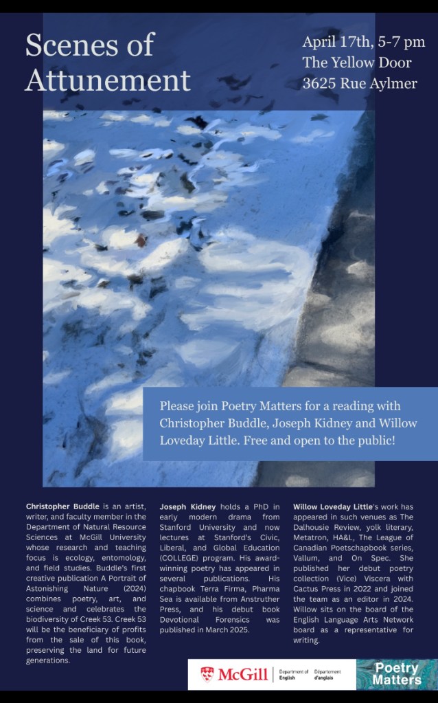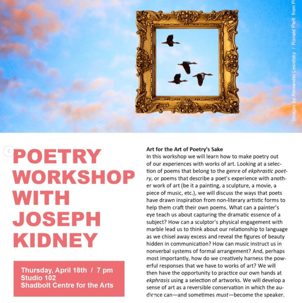 April 18th: Burnaby, BC (As Deer Lake Artist in Residence, Poetry workshop on ekphrasis at Shadboldt Center for the Arts)April 17th: Burnaby, BC (As Deer Lake Artist in Residence, Reading at Shadboldt Center for the Arts)